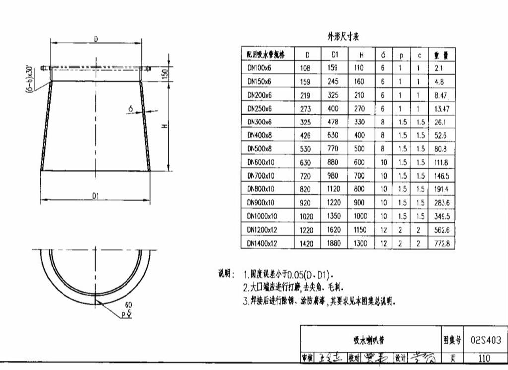 只不過它是有斜度的直上直下的那么一種變徑。而不是像我們正常的異徑管大小頭一樣,它都是緩慢的,有一個坡度那樣的緩緩的變出來的,你如果從下面往上看,它就是一條線的。那樣的比直。只不過這樣的一個用中板卷制成功的形式的直邊異徑管,在這個建筑圖集上被叫做吸水喇叭口。http://m.cqdmz.com.cn